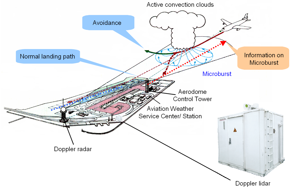 Rainfall is monitored by Doppler radars at nine airports. These units are also capable of observing three-dimensional wind fields to detect low-level wind shear, which is often hazardous to aircraft during takeoff and landing in conditions of precipitation. When there is no precipitation, three-dimensional wind fields are observed using Doppler lidars at three airports.