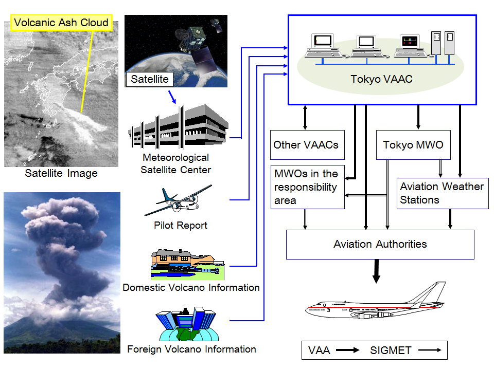 Clouds of volcanic ash ejected by active volcanoes contain hazardous materials, which can seriously hinder airplane engine operation. In its role as the Tokyo Volcanic Ash Advisory Center (VAAC) as designated by the International Civil Aviation Organization (ICAO) in cooperation with WMO, JMA provides Volcanic Ash Advisories (VAAs) detailing the current status and forecasts of volcanic ash clouds for East Asia, the Northwest Pacific region and part of Arctic Circle.