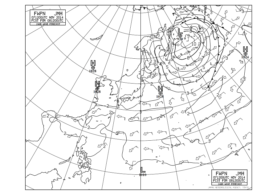 Marine meteorological forecasts and warnings such as those for gales, storms, typhoons and fog are provided for the safety and efficiency of shipping, fisheries and other offshore activities. JMA is responsible for preparing and issuing warnings and weather and sea bulletins through the international SafetyNET service under the framework of the GMDSS (Global Marine Distress and Safety System) for the high seas mainly in the western North Pacific. Detailed marine safety information is provided for the sea areas around Japan through the international NAVTEX service. Graphical information (including surface weather maps and ocean wave charts) is broadcast through JMH (by radiofacsimile) for the western North Pacific. In the winter season, sea ice forecasts and bulletins are also issued for the Sea of Okhotsk.