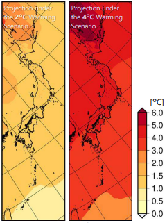 ![]() Changes in annual surface temperature for the end of the 21st century (2076 – 2095 average) relative to the end of the 20th century (1980 – 1999 average) (picture from Climate Change in Japan The 2020 edition) |