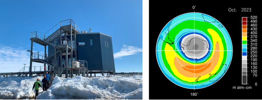 Fundamental observation building, Syowa Station (69°00’S 39°35’E) and Antarctic ozone hole in October 2023 (gray area), based on NASA satellite data. |