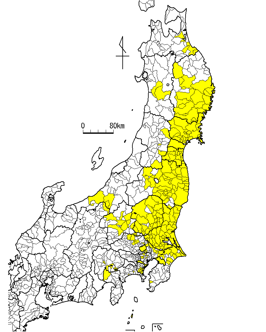 In the earthquake affected area, the risk of sediment disaster is higher than usual because the soil in these areas has been shaken and loosen. Considering possible damages to soils by the 2011 Great East Japan Earthquake on 11th March 2011 as well as the subsequent large earthquakes which occurred in Nagano and Shizuoka prefecture on 12th and 15th March in 2011 respectively, JMA has been tentatively operating by lowering the criteria of soil water indexes for its heavy rain warning/advisory for all municipalities (colored in yellow in the below figure) where 5 + or greater of JMA seismic intensities were observed in those earthquakes.