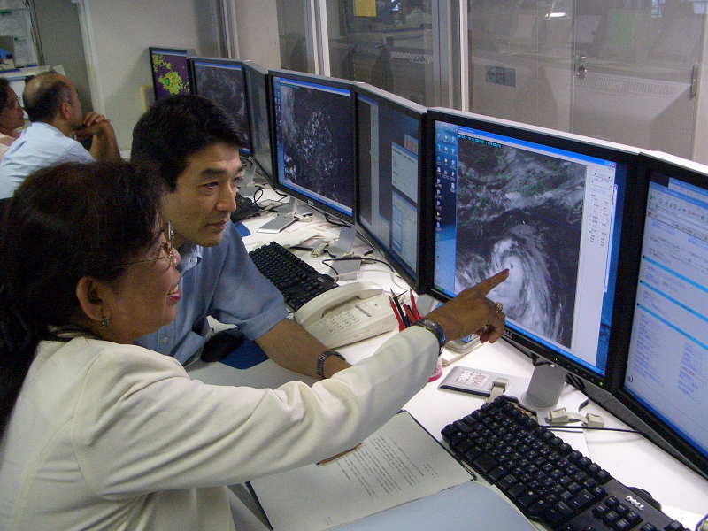 Two woman forecasters, Ms. Sorany Luch from Cambodia (MOWRAM) and Ms. Avelina G. Postanes from Philippines (PAGASA), visited the Japan Meteorological Agency (JMA) from 18 to 27 July 2007 to participate in the Seventh Typhoon Committee Training Seminar (on-the-job training in typhoon operations) at the RSMC Tokyo - Typhoon Center. Two forecasters learned skills to analyze tropical cyclones, including typhoons, using satellite imagery and other synoptic data.