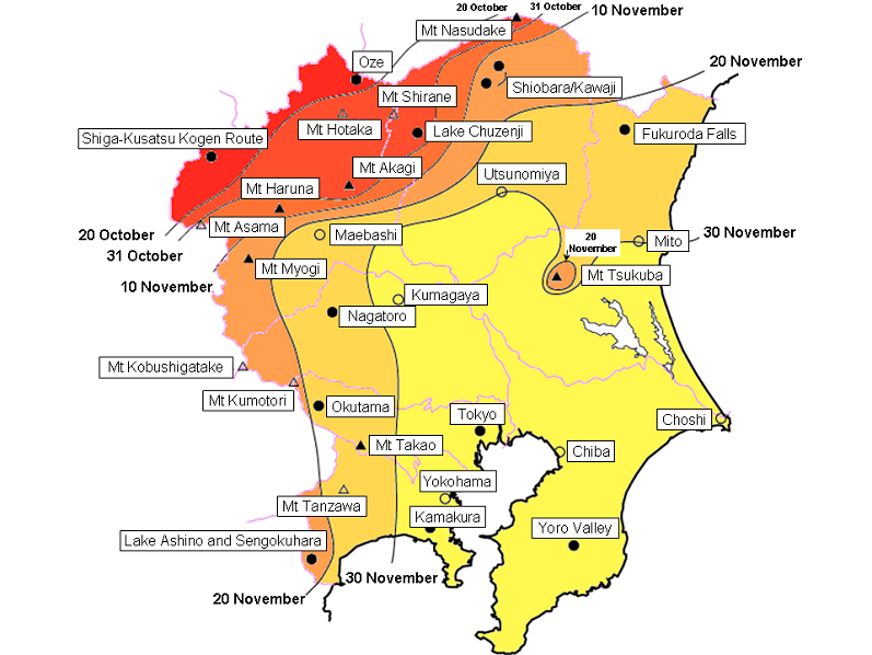 The below figure and the table indicate dates when red and yellow leaves are expected to be at their peak in the Kanto region of Japan in 2007. |