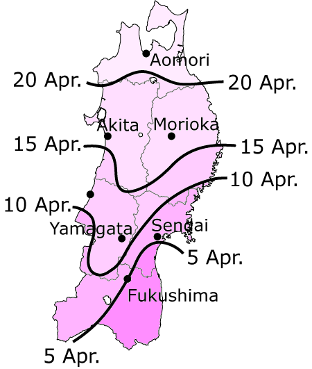 The figure below indicates the dates when cherry blossoms are expected to bloom in Japan in 2009. |