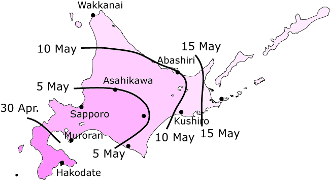 The figure below indicates the dates when cherry blossoms are expected to bloom in Japan in 2009. |