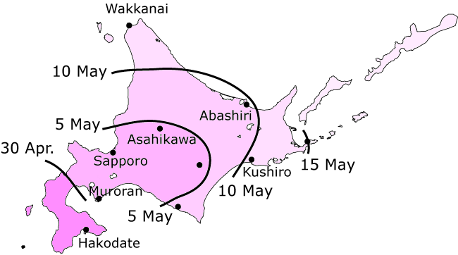 The figure below indicates the dates when cherry blossoms are expected to bloom in Japan in 2009.