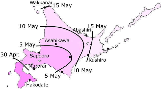 The figure below indicates the dates when cherry blossoms are expected to bloom in Japan in 2009. |