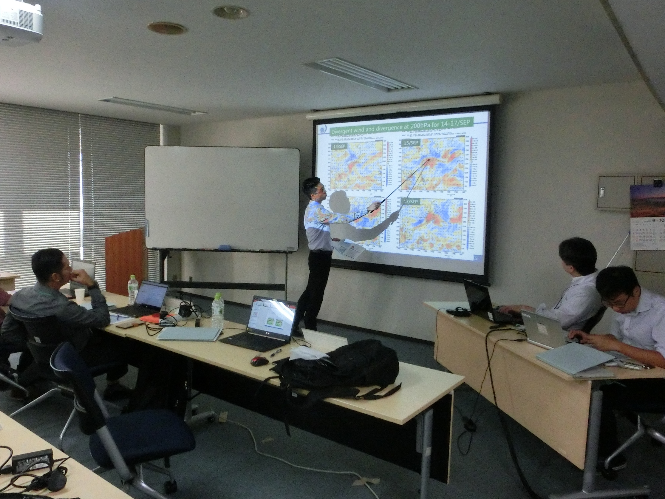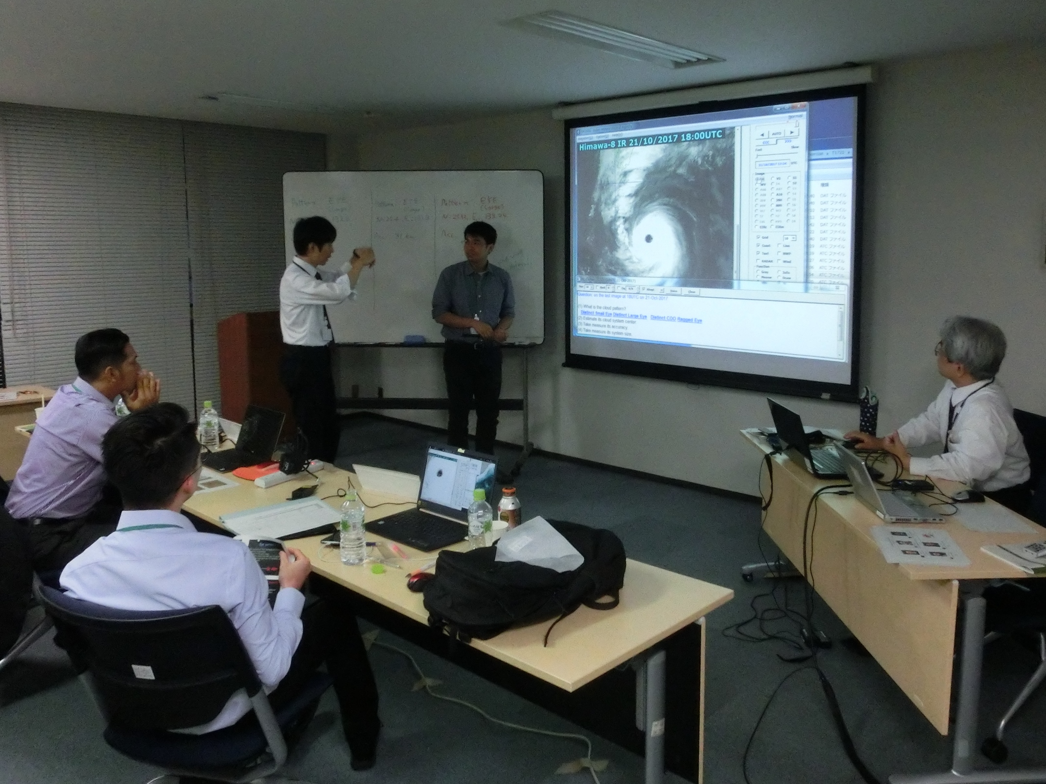 The training focused on practical knowledge and skills related to operational TC analysis and forecasting via lectures and exercises. The TC analysis course covered a range of subjects including interpretation of satellite imagery and Dvorak analysis techniques involving the use of the Satellite Analysis and Viewer Program (SATAID), and other analysis techniques based on microwave imagery, Doppler radar data and sea-surface Atmospheric Motion Vector data. TC forecasting subjects included techniques involving the use of various types of guidance and information sources along with storm surge and wave forecasting. Presentations and exercises were also provided on public weather services, including the setting of warning criteria based on disaster statistics, key roles of quantitative precipitation estimation and forecasting techniques, appropriate provision of disaster risk reduction (DRR) information, and forecast skill evaluation, to enhance capacity in the development and implementation of effective warning systems in collaboration with DRR operators. All attendees gave presentations to help JMA staff understand the current status of their meteorological and hydrological services, including those relating to TCs and warnings.