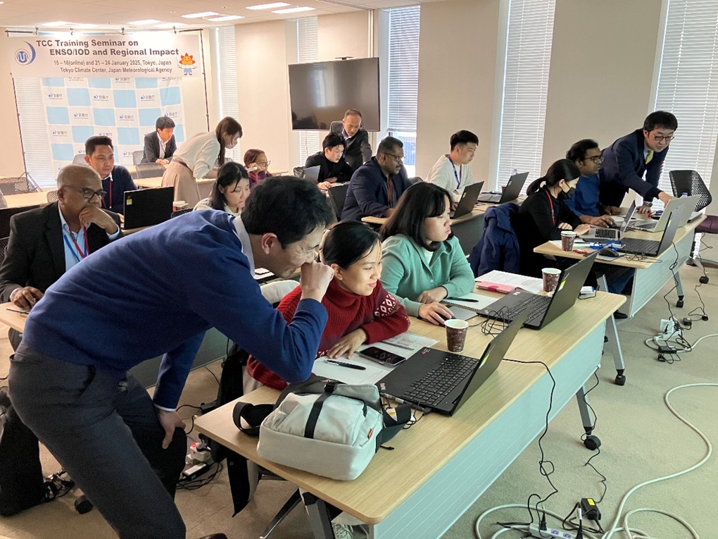 In this context, the Center held the training seminar on ENSO/IOD and regional impact on 15-16 (online) and 21-24 (face to face at JMA headquarters) January 2025. The seminar was attended by 12 trainees from NMHSs in Bangladesh, Bhutan, Hong Kong (China), Malaysia, Mongolia, Nepal, Pakistan, the Philippines, Singapore, Sri Lanka, Thailand, and Vietnam. The seminar focused on improving knowledge about climate system, and on enhancing skills in analyzing impacts of oceanic variability such as ENSO/IOD on regional atmospheric conditions, by using the Interactive Tool for Analysis of the Climate System (iTacs). At the end of the seminar, all participants gave presentations regarding ENSO/IOD's impacts on climate of their countries and had fruitful discussions with TCC staffs.