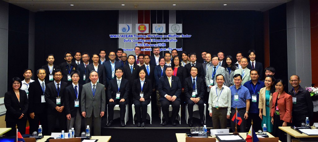 The WMO and the Association of the Southeast Asian Nations (ASEAN) ran the WMO/ASEAN Training Workshop on Weather Radar Data Quality and Standardization in Bangkok, Thailand, from 5 to 13 February 2018, with full support from JMA and the hosting Thai Meteorological Department (TMD). Radar experts from nine National Meteorological and Hydrological Services (NMHSs) in ASEAN members (Cambodia, Indonesia, Lao PDR, Malaysia, Myanmar, the Philippines, Singapore, Thailand and Viet Nam) and Bangladesh attended, and JMA dispatched experts to give presentations and provide training. The Chair and Vice-chair of the WMO Inter-Programme Expert Team on Operational Weather Radars (IPET-OWR) and representatives of weather radar manufacturers in Japan and Germany also gave presentations.