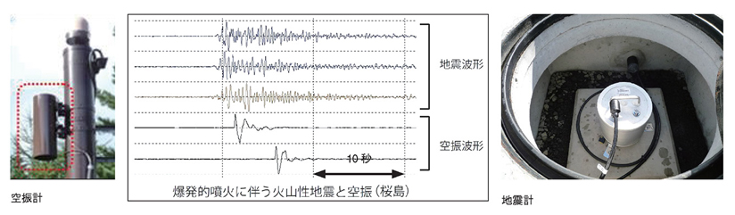空振観測は、火山の爆発的噴火などで生じる空気の振動をとらえるものです。天候不良等により監視カメラで火山の状況を監視できない場合でも、地震計による地震記録や空振計による空振記録等より、噴火の発生と規模をいち早く検知することができます。