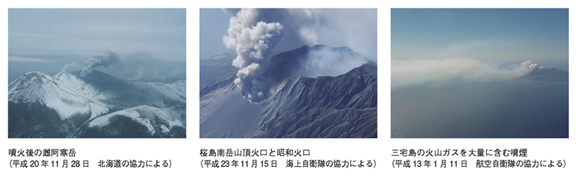 関係機関の協力により、ヘリコプター等を用いてカメラや赤外熱映像装置により、地上からでは近づけない火口内の様子(温度分布や噴煙の状況)や噴出物分布を上空から詳しく調査・把握し、火山活動の評価に活用します。
