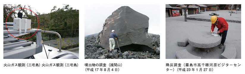 噴火が発生した場合には、噴火の規模や特徴等を把握するため、大学等研究機関と協力して降灰や噴出物の調査を行い、火山活動の評価に活用します。