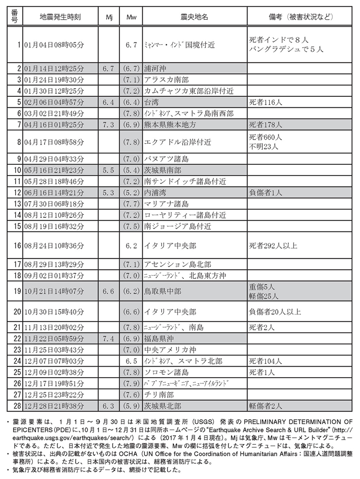 平成28年(2016年)に発生したマグニチュード7.0以上または死者(行方不明者を含む)を伴った地震は28回(平成27年は27回)でした。また、マグニチュード8.0以上の地震はありません(平成27年は2回)でした。最も規模の大きかった地震は、12月17日にパプアニューギニア、ニューアイルランドで発生したMw7.9の地震でした。海外の地震により日本で津波を観測した地震はありませんでした。