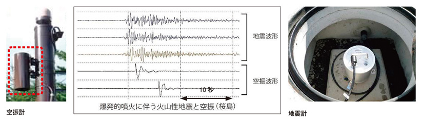 空振観測は、火山の爆発的噴火などで生じる空気の振動をとらえるものです。天候不良等により監視カメラで火山の状況を監視できない場合でも、地震計による地震記録や空振計による空振記録等より、噴火の発生と規模をいち早く検知することができます。