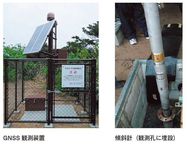 地殻変動観測は、地下のマグマの活動等に伴って生じる地盤の傾斜変化や山体の膨張・収縮を観測するものです。傾斜計では火山周辺で発生するごく微小な傾斜変化をとらえることができます。また、GNSS観測装置では、複数のGNSS観測装置を組み合わせて2点間の距離の伸縮を計測することで火山周辺の地殻の変形を検出することができます。いずれも地下のマグマ溜まりの膨張や収縮を知り、火山活動を評価するための重要な手段となります。