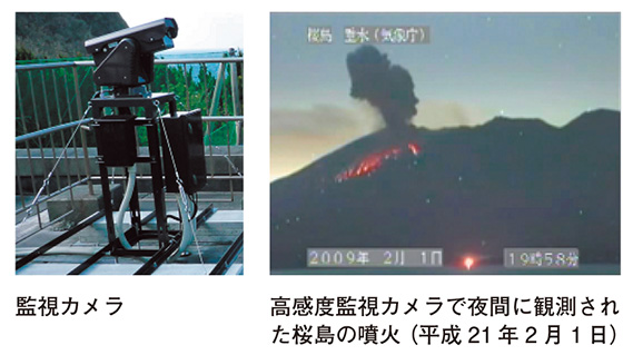 ○監視カメラによる観測 監視カメラにより、定まった地点から、噴煙の高さ、色、噴出物(火山灰、噴石など)、火映などの発光現象等を観測しています。気象庁では、星明かりの下でも観測ができる高感度の監視カメラを設置しています。