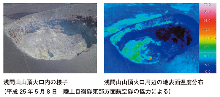 関係機関の協力により、ヘリコプター等を用いてカメラや赤外熱映像装置により、地上からでは近づけない火口内の様子(温度分布や噴煙の状況)や噴出物分布を上空から詳しく調査・把握し、火山活動の評価に活用します。