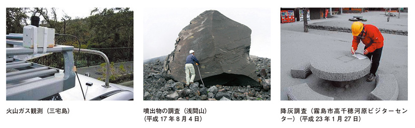 噴火が発生した場合には、噴火の規模や特徴等を把握するため、大学等研究機関と協力して降灰や噴出物の調査を行い、火山活動の評価に活用します。