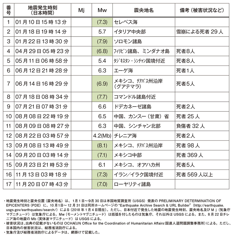 平成29年(2017年)に発生したマグニチュード7.0以上または死者(行方不明者を含む)を伴った地震は17回でした。また、マグニチュード8.0以上の地震は1回でした。最も規模の大きかった地震は、9月8日にメキシコで発生したMw8.1(気象庁による)の地震でした。海外の地震により日本で津波を観測した地震はありませんでした。