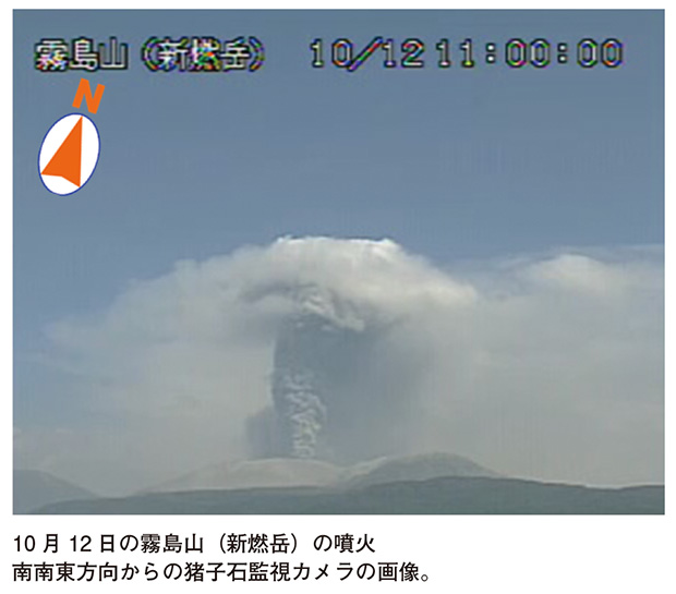 その後、国土地理院によるGNSS連続観測結果では霧島山を挟む基線で7月頃から伸びの傾向が続きました。9月23日頃から火口直下付近を震源とする火山性地震が増加し、10月4日から振幅も次第に大きくなり、小規模な噴火の可能性があるとの判断で10月5日に噴火警戒レベルを1(活火山であることに留意)から2(火口周辺規制)に引き上げました。9日に火山性微動と傾斜変動が発生し、11日05時34分頃に小規模な噴火が発生しました(新燃岳の噴火は2011年9月7日以来)。火山性微動と傾斜変動は継続し噴火活動が活発化する可能性があるとの判断で、11日11時05分に噴火警戒レベルを2(火口周辺規制)から3(入山規制)に引き上げました。噴煙は火口縁上2,000mまで上がり、降灰は宮崎県宮崎市、都城市、小林市、高原町で確認されました(聞き取り調査)。噴火は13日16時頃に一度停止した後、14日08時23分に再開し、噴煙は火口縁上2,300mまで上がりました。14日の降灰は、新燃岳周辺から北東側の高原町、小林市、西都市、新富町、西米良村、日向市、美郷町で確認されました(聞き取り調査)。15日には火山ガス(二酸化硫黄)の放出量が1日あたり11,000トンと急増し、さらに噴火が活発になる可能性があるとの判断で、15日19時00分に噴火警戒レベル3(入山規制)の警戒が必要な範囲を火口から概ね3kmに拡大しました。16日以降、火山ガス(二酸化硫黄)の放出量は減少し、噴火は17日の00時30分頃に停止したとみられます。これらの噴火で火口外に飛散する大きな噴石や火砕流は確認されていません。一方、低周波地震は引き続き発生していたことから、大きな噴石が火口から概ね2kmまで、火砕流が概ね1kmまで達する噴火は発生する可能性があるとの判断で、31日に噴火警戒レベル3(入山規制)の警戒が必要な範囲を火口から概ね2kmに縮小しました。