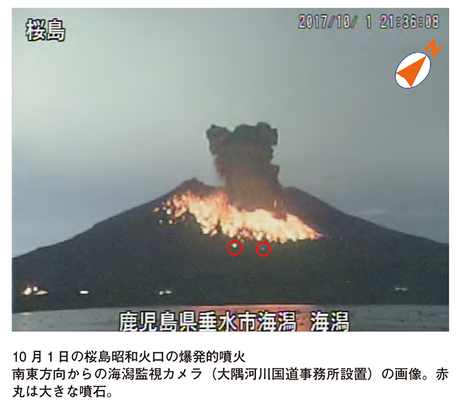 昭和火口では、4月26日の噴火以降10月中旬頃まで活発な噴火活動が継続し、特に8月中旬以降は活発な状況でした。年間の噴火は394回(2016年:142回)、このうち爆発的噴火は77回(2016年:47回)で、5月2日の噴火では、桜島の西側から北西側の鹿児島市から日置市及びいちき串木野市にかけての広い範囲で降灰を確認し、9月29日と10月1日の爆発的噴火では大きな噴石が4合目まで達しました。