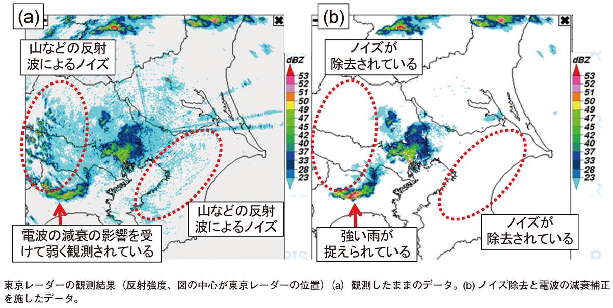 令和2年(2020年)3月、千葉県柏市にある気象庁の東京レーダーを、新型のレーダー(二重偏波気象ドップラーレーダー)に更新しました。従来のレーダーでは、水平方向に振動する電波(水平偏波)だけを発射し、雨粒等からの反射波を受信して雨の強さを推定していましたが、新型レーダーでは、垂直方向に振動する電波(垂直偏波)も同時に発射・受信することができます。これにより、雨雲とノイズ(山などからの反射波)を区別する能力や雨の強さを正確に捉える能力が大幅に改善されました。下図は、新型レーダーによる観測結果で、値が大きいほど雨が強いことを示します。左図(a)は観測したままのデータ、右図(b)は(a)に対しノイズ除去と雨による電波の減衰の影響を補正したデータです。(b)では、山などのノイズが除去されているとともに、補正によって図中左下の降水域においてより強い雨が捉えられていることが分かります。