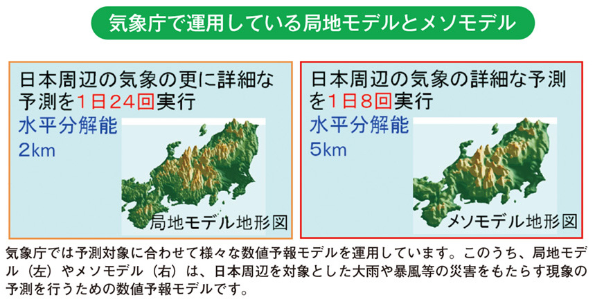 これらの研究・技術開発の成果を踏まえて高度化した数値予報モデルを実装するため、気象庁の現行のスーパーコンピュータシステムに加えて計算資源を増強します。これにより、局地モデル(下図参照)については、現在10時間先までである予報時間の18時間先までへの延長を、従前の計画より3年前倒して令和5年度(2023年度)末に、現在2キロメートルである水平解像度の1キロメートルへの高解像度化を4年前倒して令和7年度(2025年度)末に、それぞれ実現する計画です。また、局地アンサンブル予報※システムについては、解像度2キロメートル・17メンバーにて令和11年度(2029年度)末の運用開始を目指していましたが、メンバー数を増強した上で4年前倒しすることとし、令和7年度末に解像度2キロメートル・50メンバーでの運用を開始する計画です。