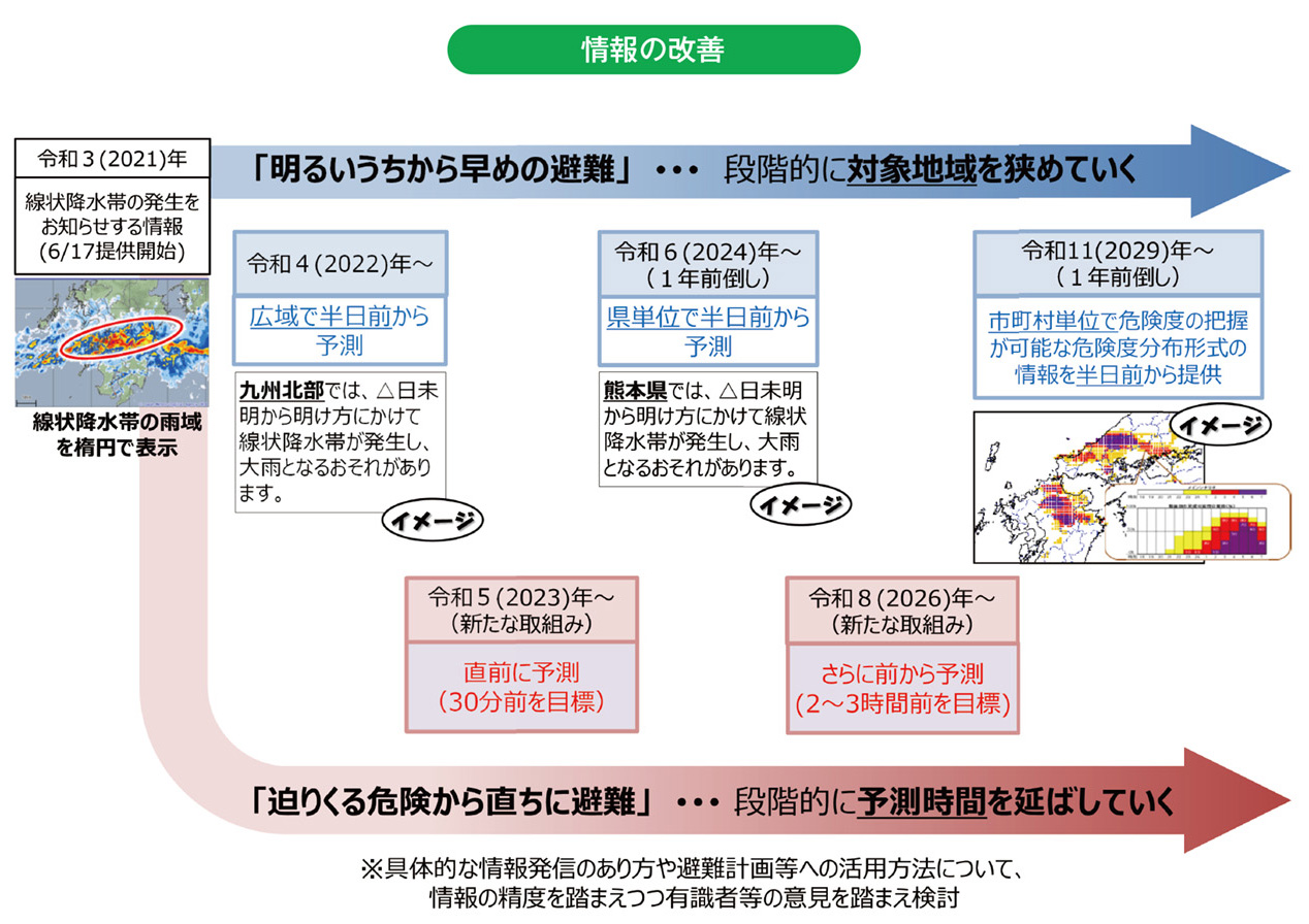 これら観測・予測の強化の成果を踏まえ、これまで線状降水帯の発生後の情報提供にとどまっていたところを、令和4年(2022年)より、線状降水帯の発生の予測を開始し、その後も情報の改善(上記(ⅲ))を段階的に進めます。