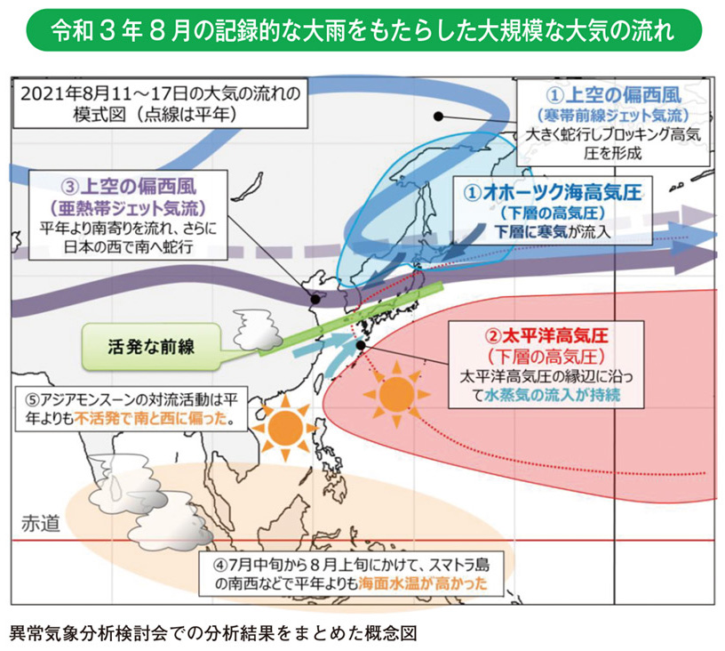 異常気象分析検討会における分析から、この記録的な大雨には日本を取り囲む広い地域の大気の流れの変動が影響していたことが分かりました。まず、8月初め以降、東シベリア上空で発達したブロッキング高気圧(中・高緯度の上層の強い偏西風(ジェット気流)が南北に大きく蛇行した際に発生・停滞することがある大規模な高気圧)に伴って、日本の北で地表の冷たいオホーツク海高気圧が持続的に強まりました(図中①)。同時に、太平洋高気圧が平年より南に偏って日本の南海上に張り出しました。このため、盛夏期にもかかわらず梅雨の後半のような大気の流れとなり、日本付近に前線帯が形成されました。さらに、中国大陸から、また太平洋高気圧の縁辺に沿って、多量の水蒸気が前線帯に集中的に流れ込む状態が続いたことで、広範囲で持続的な大雨となりました(②)。このとき、対流圏上層(上空10キロメートル付近)では、東アジアから日本上空で亜熱帯ジェット気流が全般に平年より南に位置し日本の西方で著しく南に蛇行していました。その影響で、上空の気圧の谷が日本の西方に位置する状況下で、西日本から東日本では上昇気流が起きやすく、降水活動が維持されやすい状況となっていました(③)。7月中旬から8月上旬前半の熱帯の海面水温は、平年と比べてスマトラ島の南西で高く(④)、インド洋西部で低くなっており、これに対応してアジアモンスーン域の対流活動は南シナ海~フィリピンの東で平年よりも不活発となり、活動の中心が平年よりも南及び西に偏っていました(⑤)。統計的な調査からは、不活発で南西に偏ったアジアモンスーンの活動が東アジア上空の亜熱帯ジェット気流を全体的に南下させ、日本の西方での気圧の谷の形成に影響した可能性が示唆されています。