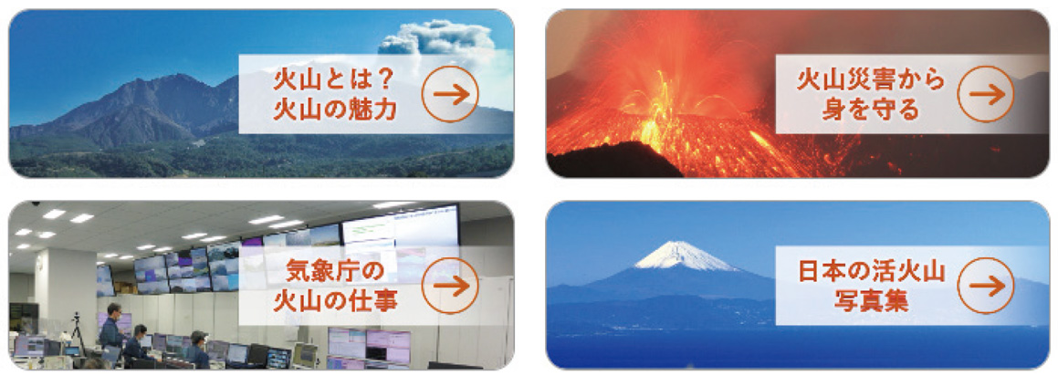 この特設サイトでは、「火山とは?」から始まり、火山災害から身を守るための知識や気象庁の火山防災情報について解説しています。各火山の写真や魅力を通じて火山を知っていただくためのコンテンツを揃えており、中学生や高校生、また、火山には馴染みのない方でも読みやすい内容となっておりますので、学校やご家庭での日頃の災害対策の見直しや、地域の防災教育等にご活用ください。