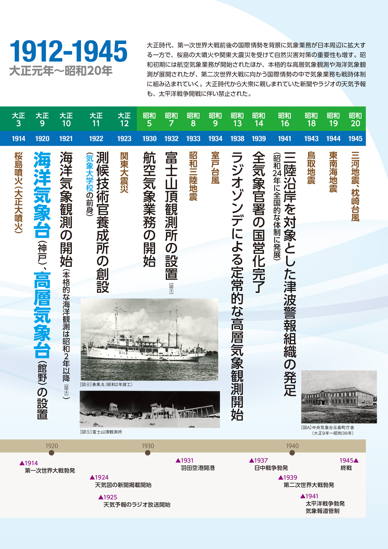 明治末期には火山観測がはじまり、大正時代に入ると海運の発展を背景として神戸に「海洋気象台」が設置されたほか、「高層気象台」、「地磁気観測所」、「測候技術官養成所」(のちの気象大学校)が誕生します。また、第一次世界大戦前後の国際情勢の中で、外地にも気象業務が拡大していきます。