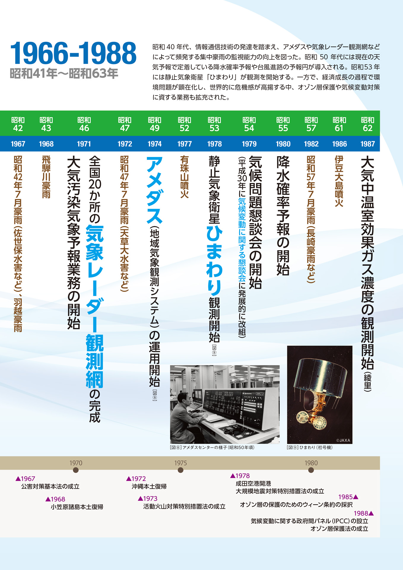 国内でも情報通信技術を駆使して、頻発する集中豪雨への対策のため、昭和46年(1971年)には全国20か所の気象レーダー観測網を完成させ、昭和49年(1974年)には「地域気象観測システム(アメダス)」の運用を開始しました。