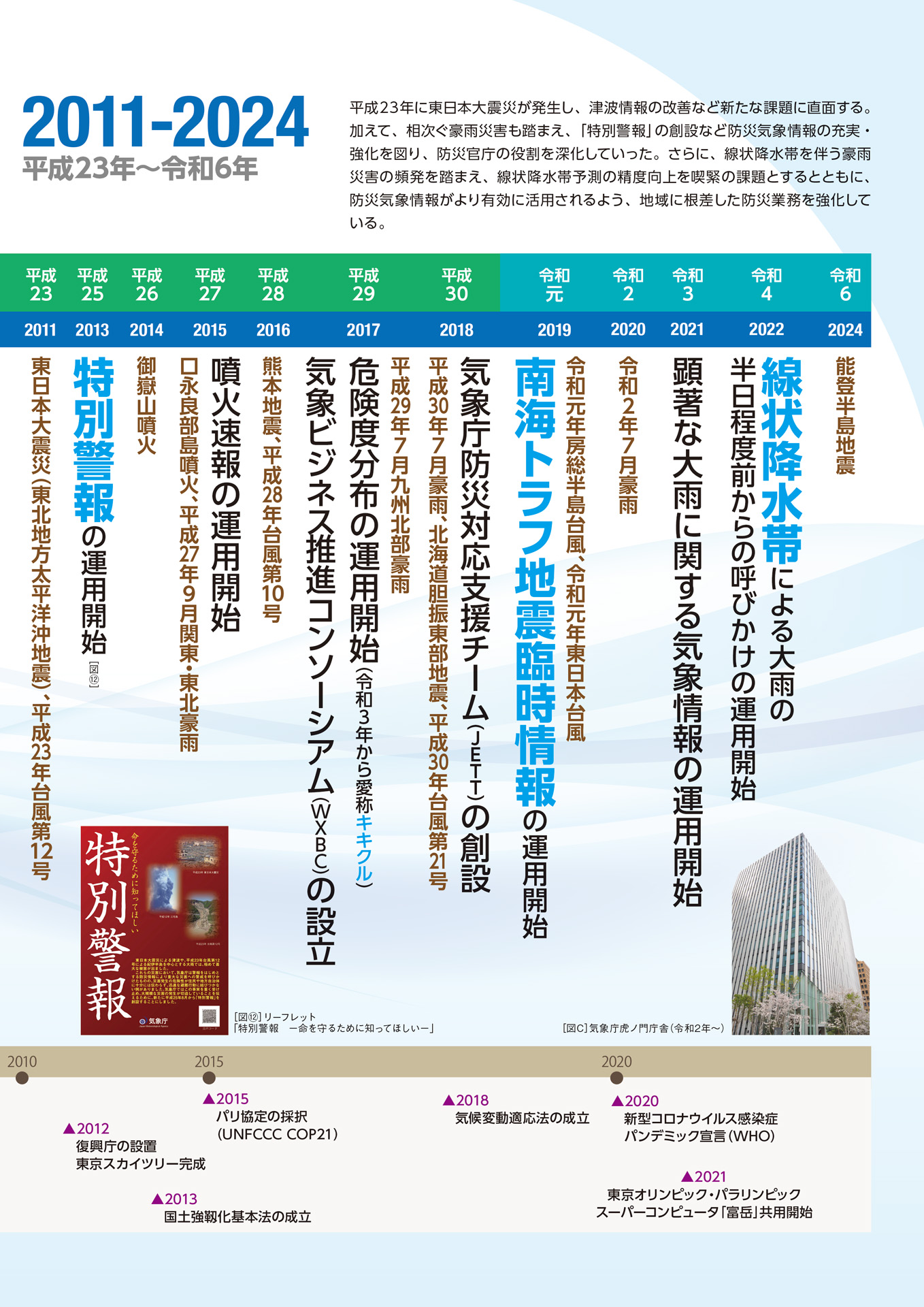 平成23年(2011年)には戦後最大となる被害をもたらした東日本大震災が発生し、気象庁は津波情報の改善など、多くの課題に取り組みました。平成25年(2013年)には「特別警報」を創設するなど、防災気象情報を充実させ、防災官庁としての役割を深化していきました。