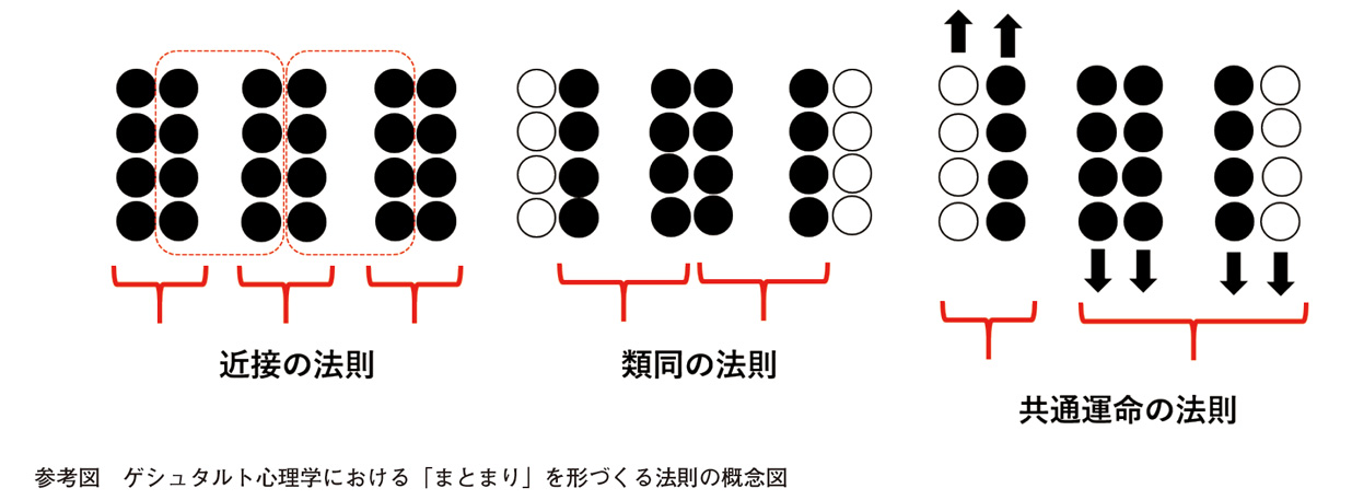 ゲシュタルト心理学は、こうした「まとまり」を形づくる法則をいくつか提起している。参考図を見てほしい。まず左の図で黒丸が24個並んでいるが、たいていの人は、左側から見て第1列と2列、3列と4列、5列と6列を一つのまとまりとして認識するだろう(中括弧)。点線で囲ったように2列と3列、4列と5列を一かたまりと感じる人はほとんどいないはずだ。近接して配置されているものはまとまりとして感覚されやすい。これを「近接の法則」という。