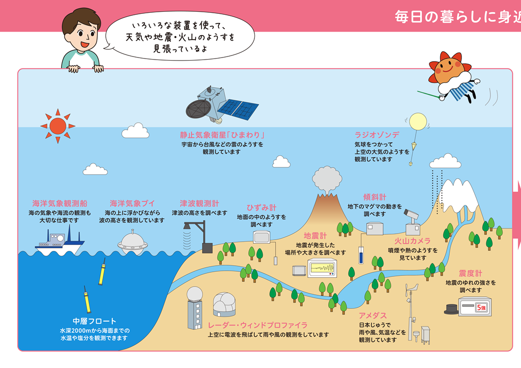 気象庁では、「雨や風などを測る観測」や、「地震と火山の監視(かんし)」を毎日行っています。