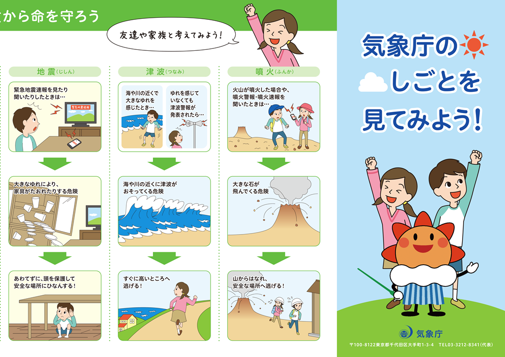 自然災害から命を守るためにはどうしたらいいか、このリーフレットを見て考えておきましょう。