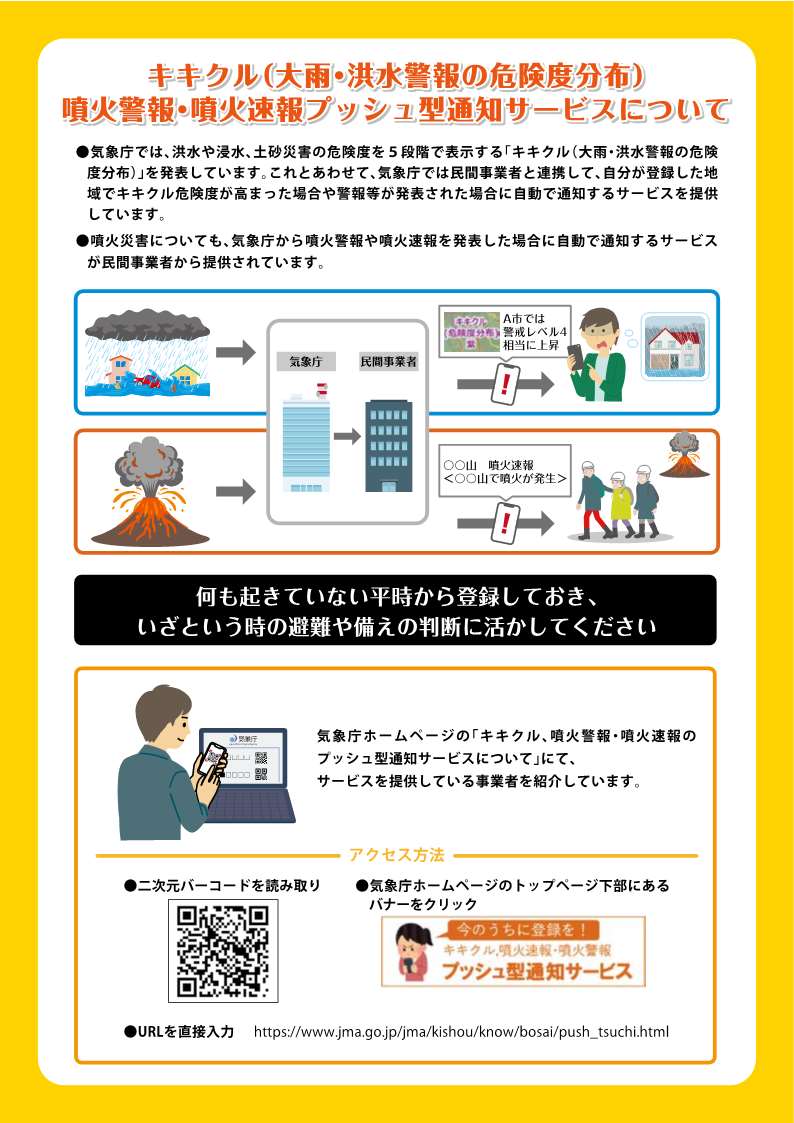 キキクル(大雨・洪水警報の危険度分布)、噴火警報・噴火速報のプッシュ型通知サービスの紹介と登録の促進を目的としたリーフレットです。